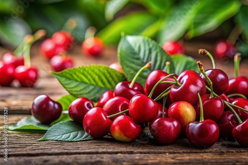 Fresh Sour Cherry Berries on a Rustic Wooden Table - High Depth of Field Photography