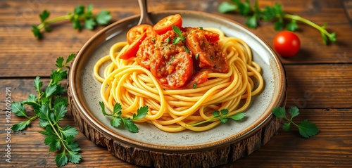 Fresh spaghetti plated on rustic wood, vibrant green herbs garnish, spaghetti, delicious