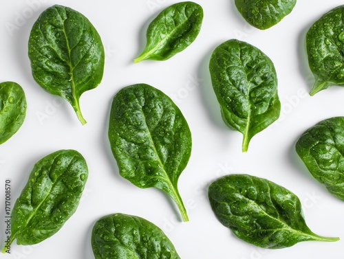 Fresh spinach leaves arranged and isolated, with vibrant green color. The leaves exhibit intricate textures and vibrant shades of green, a perfect image for promoting health