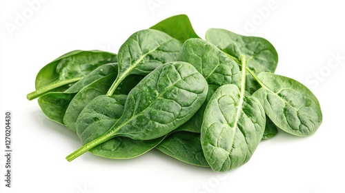 Fresh spinach leaves, deep green and crisp, isolated on white background.