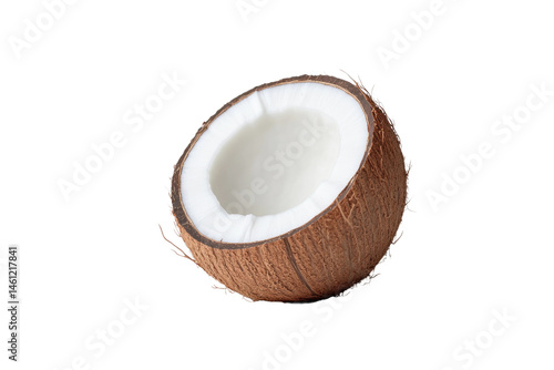 Fresh split coconut showing white flesh in detail, cut out - stock png.