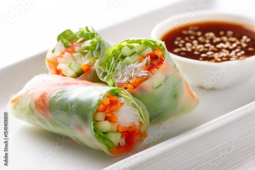 Fresh spring rolls cut in half with dipping sauce, diagonally composed with white background