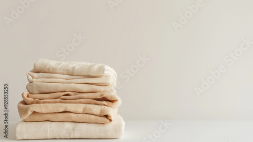 Fresh stack of light pastel beige cotton and linen fabrics, airy freshness concept. Eco detergent ad. Generative AI