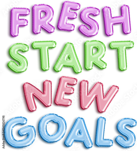 Fresh Start, New Goals, New Year Foil Balloons, Vibrant Foil Balloon Typography Design for Motivation and Inspiration - Purple, Green, Pink, and Blue Metallic Letters PNG