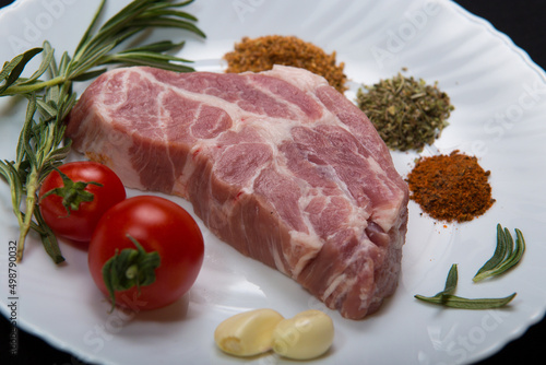 Fresh steak with spices and vegetables on a white plate and black background