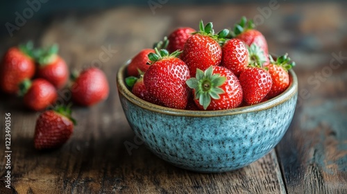 Fresh strawberries in rustic blue ceramic bowl on wooden table