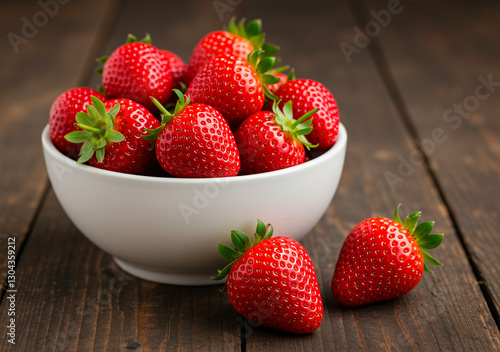 Fresh strawberries in white ceramic bowl, Organic ripe berries on rustic wooden table, Natural healthy food photography, Farm to table concept