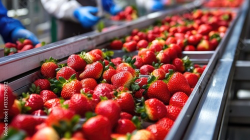 Fresh strawberries on a mechanized belt in a factory, with quality control workers checking for imperfections.