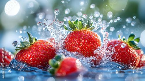 Fresh strawberries splashing in water, showcasing vibrant freshness.