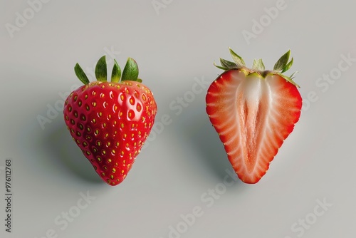 Fresh Strawberry Fruit CloseUp Juicy Red Berries with Green Leaves in white Background