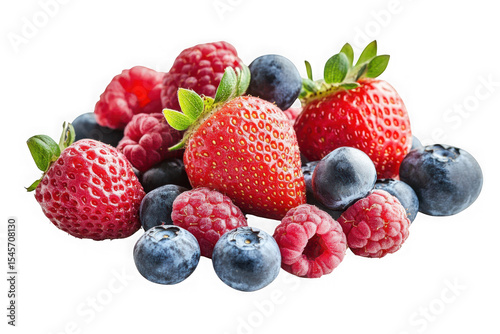Fresh strawberry raspberry blueberry fruit still life photography image for food bloggers and designers isolated on transparent background
