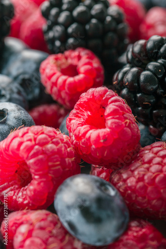 Fresh Summer Berries mix Background with Strawberry, Raspberry, Red currant, Blueberry and Blackberry.