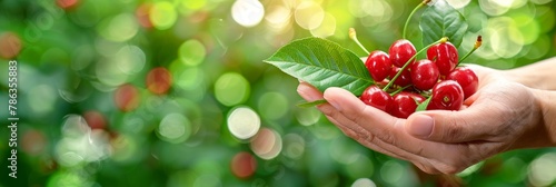 Fresh sweet cherries held in hand with selective focus on blurred background, copy space available