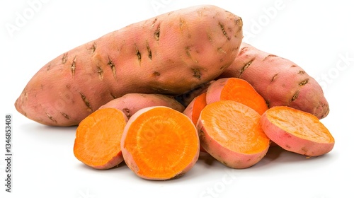 Fresh Sweet Potatoes with Vibrant Orange Flesh and Raw Slices on White Background