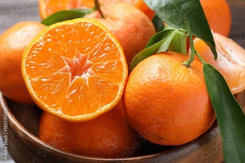 Fresh tangerines and green leaves in bowl on table, closeup