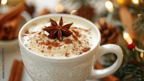 Fresh tasty eggnog cup with cinnamon powder on the table