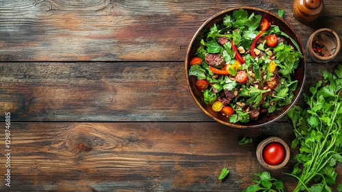 Fresh Thai beef salad with herbs, tomatoes, and rustic wooden background