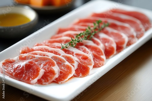 Fresh Thinly Sliced Raw Beef for Barbecue or Sukiyaki Dinner Preparation