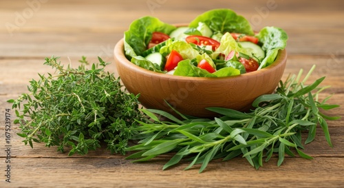 Fresh thyme and tarragon herbs arranged around a bowl of vibrant green salad on a wooden table