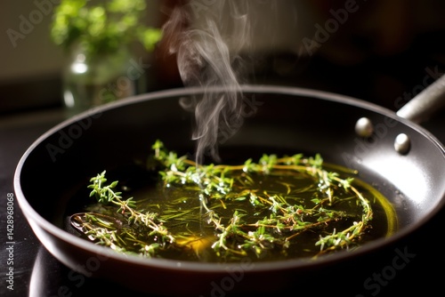 Fresh thyme sizzling in hot olive oil in frying pan with steam rising