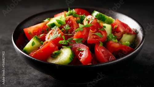 Fresh Tomato and Cucumber Salad in a Black Bowl, Healthy and Delicious