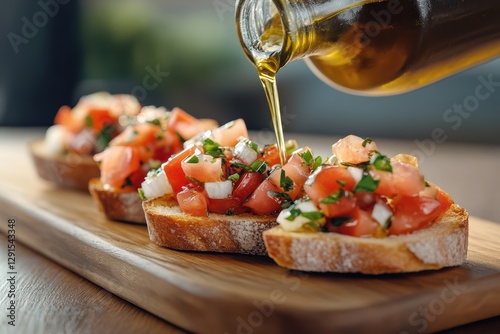 Fresh Tomato Bruschetta with Olive Oil Drizzle on Wooden Platter