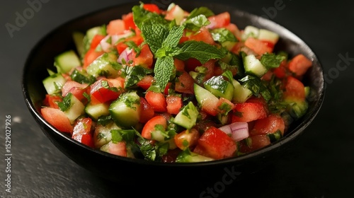 Fresh tomato, cucumber, and red onion salad with mint in a black bowl.