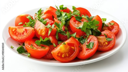 Fresh tomato salad garnished with herbs on a white plate showcasing healthy eating and vibrant vegetarian cuisine.