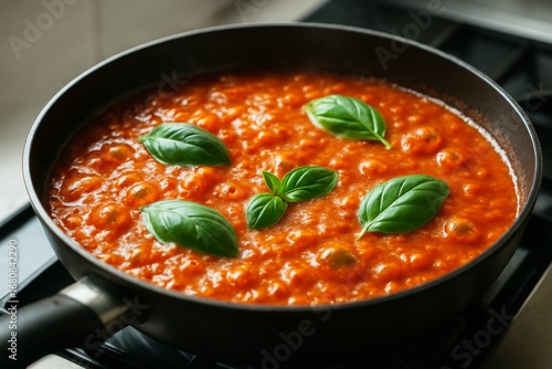 Fresh tomato sauce with bubbling texture and basil leaves in black pan on stove, photographed in natural kitchen light with soft background. Ai generative
