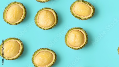 Fresh Tropical Durian Fruit Halves on Vibrant Blue Background