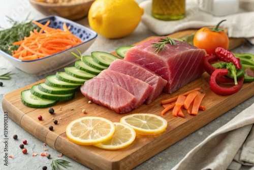 Fresh Tuna Preparation With Vegetables and Herbs on Wooden Board Generative AI