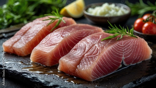 Fresh tuna steaks on a black slate board garnished with lemon, herbs, and cherry tomatoes with rice in the background Copy Space