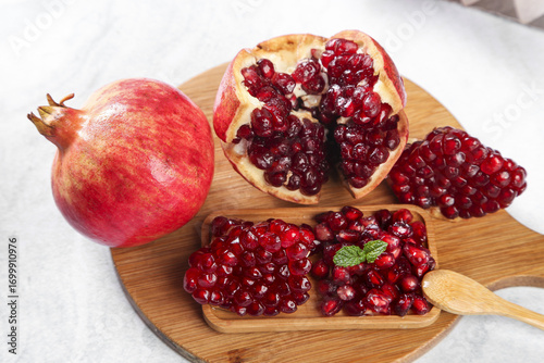 Fresh Tunisian Pomegranate Cut Open Showing Red Arils and Seeds on Wooden Board