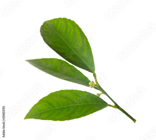 Fresh twig with green citrus leaves isolated on white