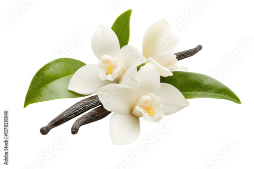 Fresh vanilla pods and white orchid flowers on green leaves, cut out