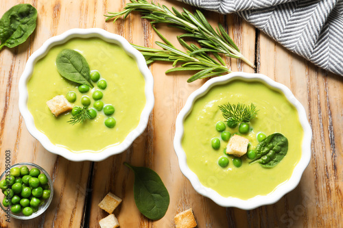 Fresh vegetable detox soup made of green peas and spinach with croutons served on table