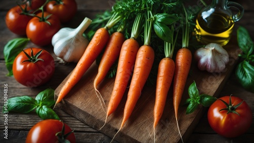 Fresh vegetable ingredients for cooking: tomatoes, basil, olive oil, garlic, and onion