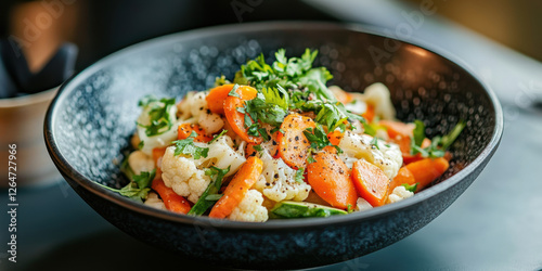 Fresh vegetable salad with cauliflower and carrots in a black bowl garnished with parsley healthy vegetarian dish