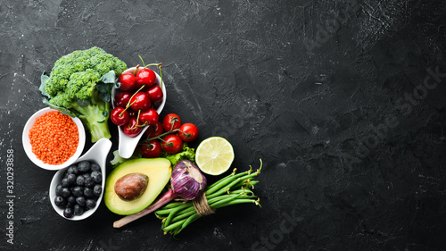 Fresh vegetables and fruits on a black background. Vitamins and minerals. Top view. Free space for your text.