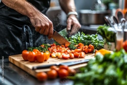 Fresh vegetables are being chopped in a modern kitchen for a healthy meal preparation at noon