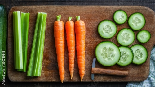 Fresh vegetables arranged on a wooden cutting board nicely displayed