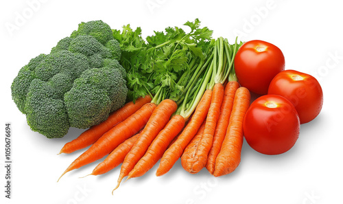 Fresh vegetables carrots, tomatoes, broccoli and coriander resting on transparent background