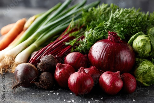 Fresh vegetables displayed on a rustic surface showcasing seasonal produce with vibrant colors and textures