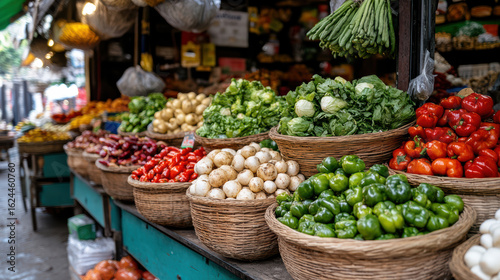 Fresh vegetables in vibrant colors displayed in woven baskets at traditional market