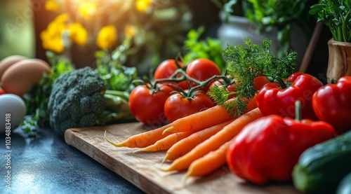 Fresh vegetables, including carrots, tomatoes, peppers, broccoli, and eggs, on a wooden cutting board.