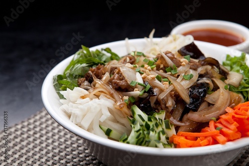 Fresh Vegetables, Raw Meat Topped with Bunbossao