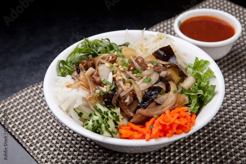 Fresh Vegetables, Raw Meat Topped with Bunbossao