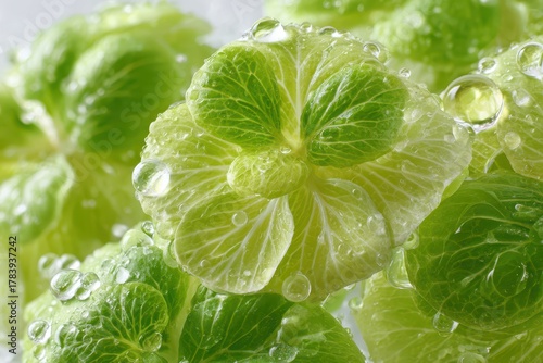 Fresh, vibrant green leaves adorned with glistening water droplets, close-up.