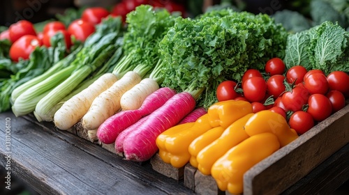 Fresh, vibrant vegetables at market. Colorful tomatoes, lettuce, radishes, peppers, and celery