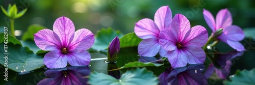 Fresh violet flowers submerged in water and foliage, flowers, stems